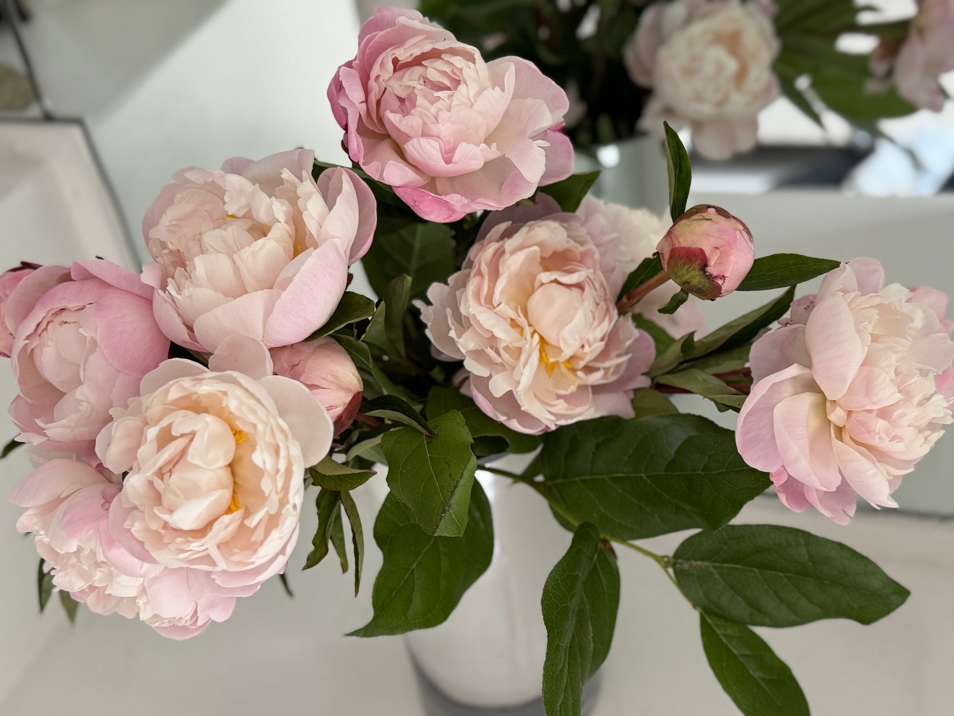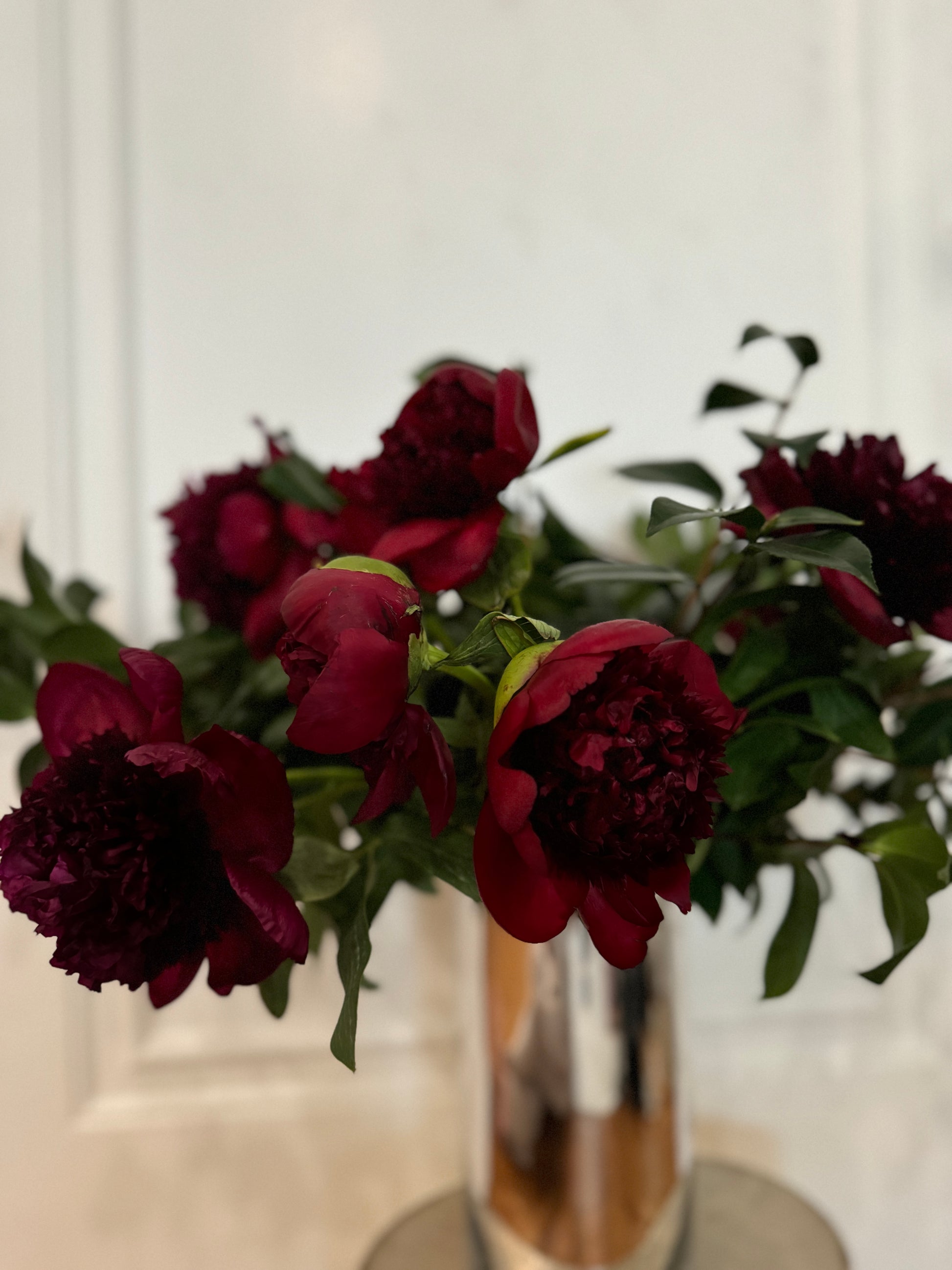 Thoughtfully composed with freshly cut, fragrant local peonies and verdant greenery, this design is delivered in a tall glass vase and presented in our most luxurious gift packaging.