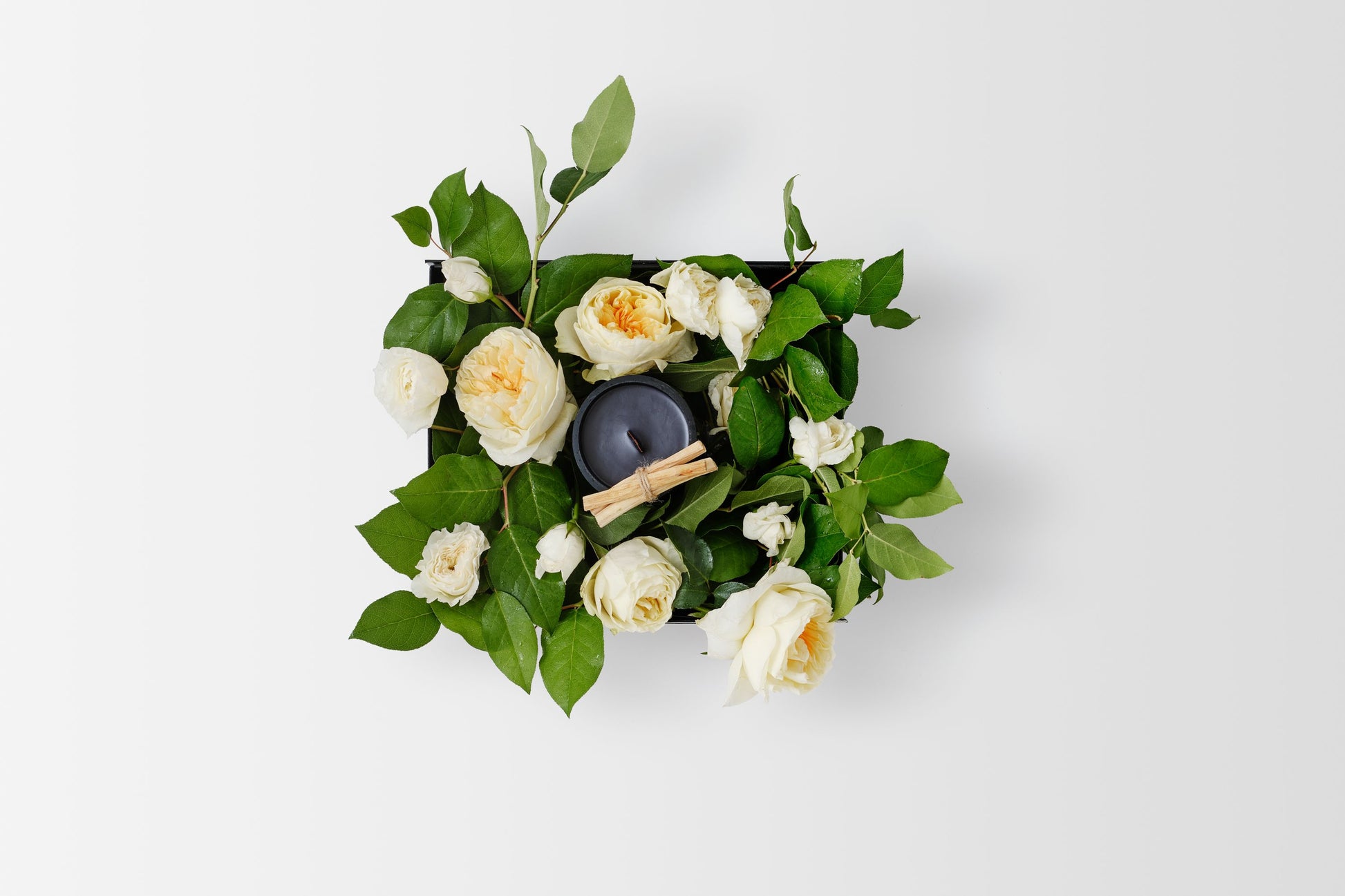 Effortlessly refined, the Medium Campfire features cut-to-order parfum garden roses and a large High Camp signature candle. Featuring lush parfum garden roses in soft hues nestled next to our signature High Camp candle, in our classic Gardenia Palo Santo scent. Our modern take on the Gardenia, this cult favorite is a warm floral scent anchored by woody citrus sophistication. A wide wooden wick and hand painted glass complete the ensemble.