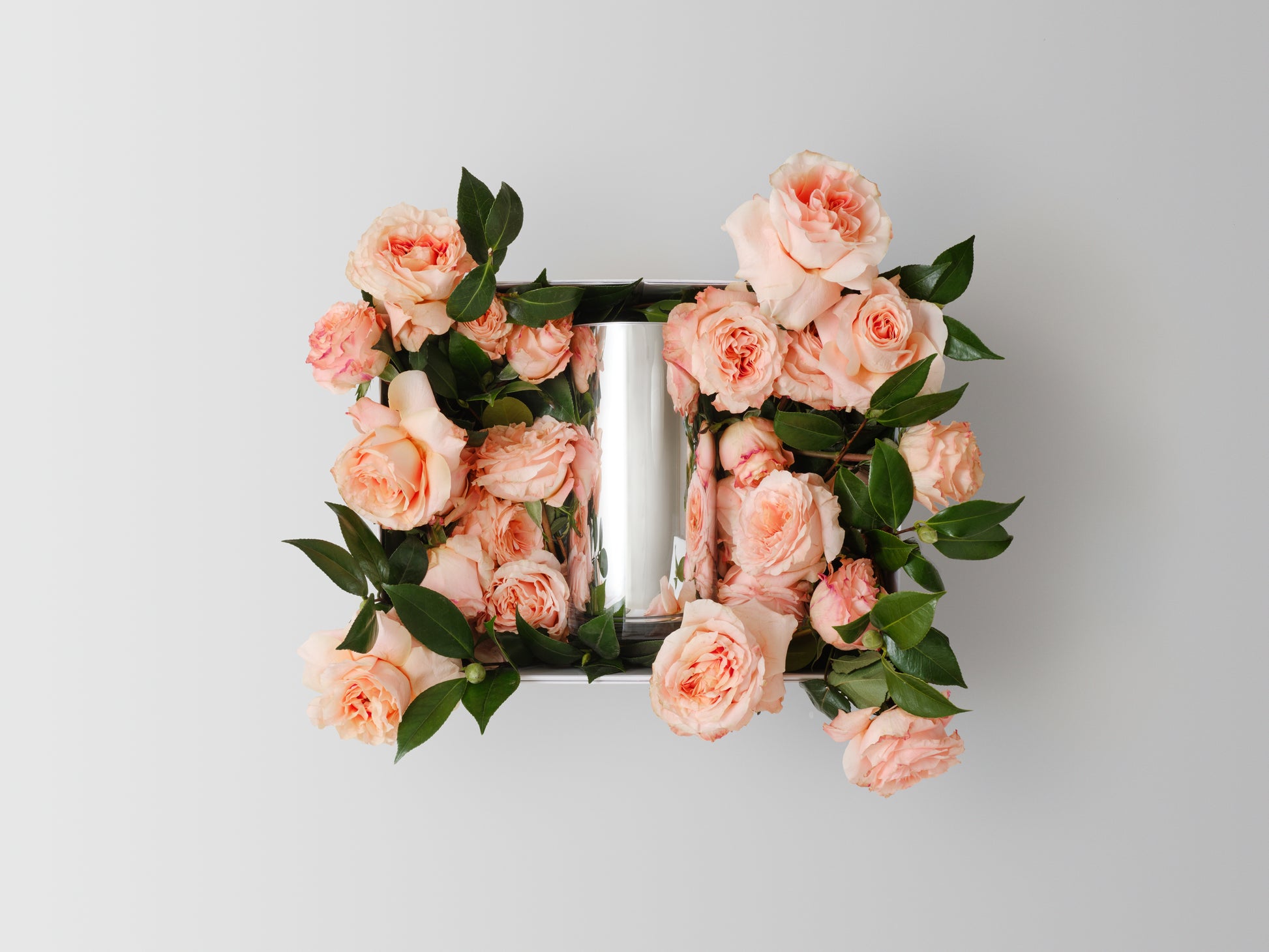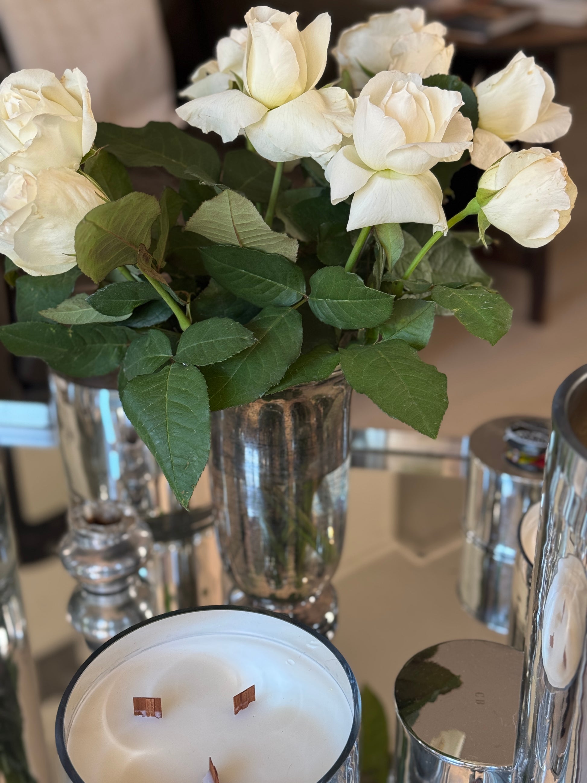 Speaking in flowers: A glorious garden for the bedside table. Soft fragrant roses and deep glossy greens pair with our signature vessel in tall or low hand cut glass.