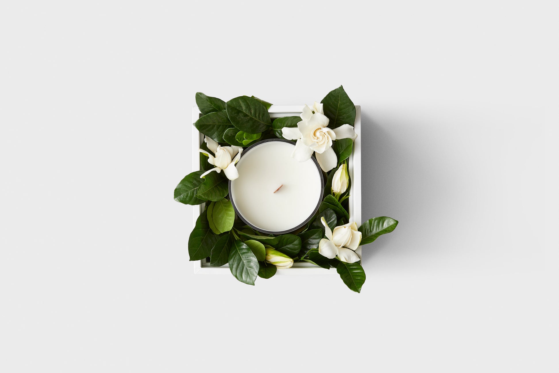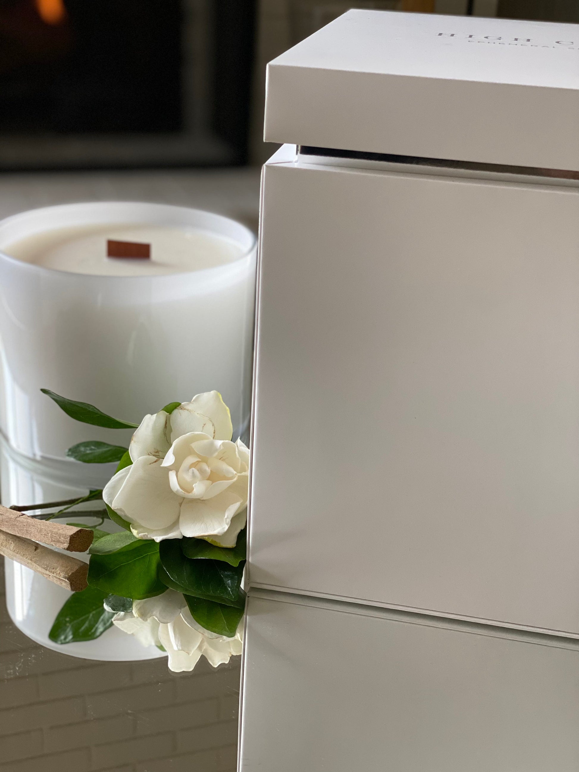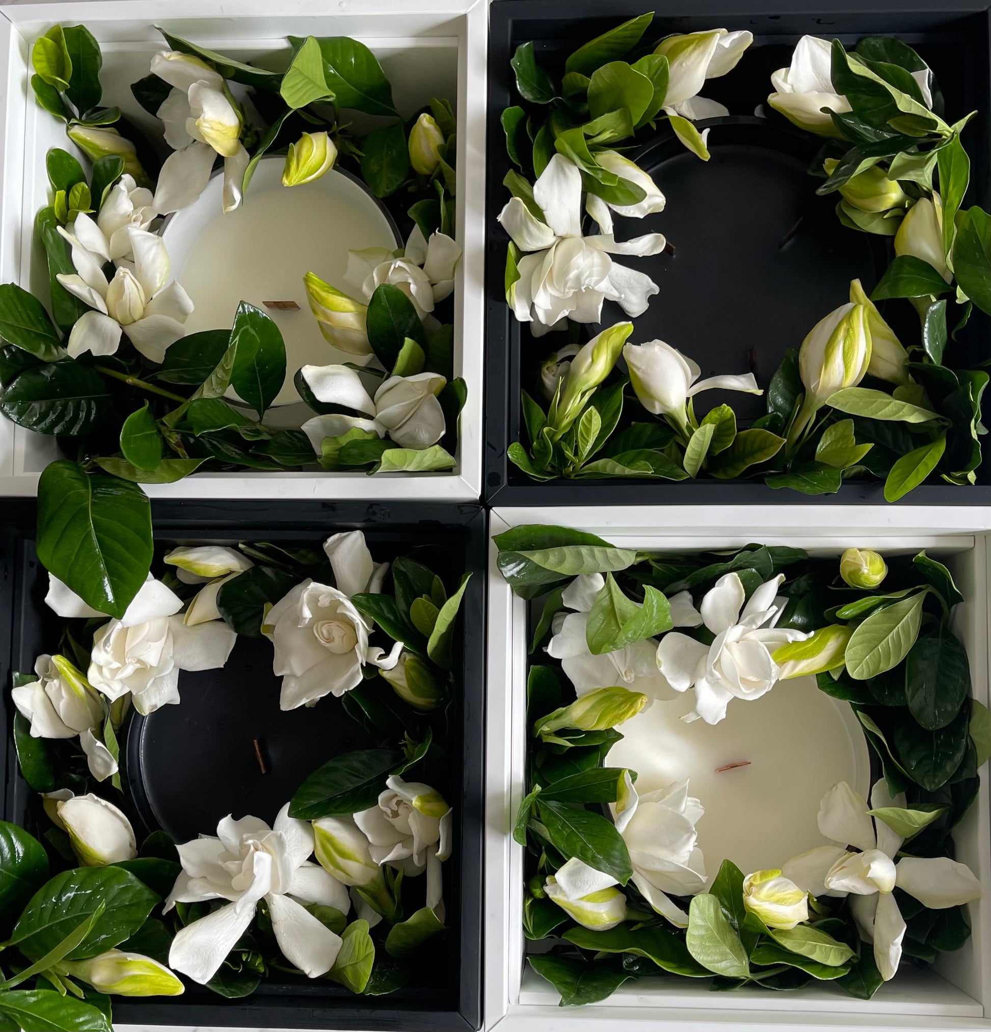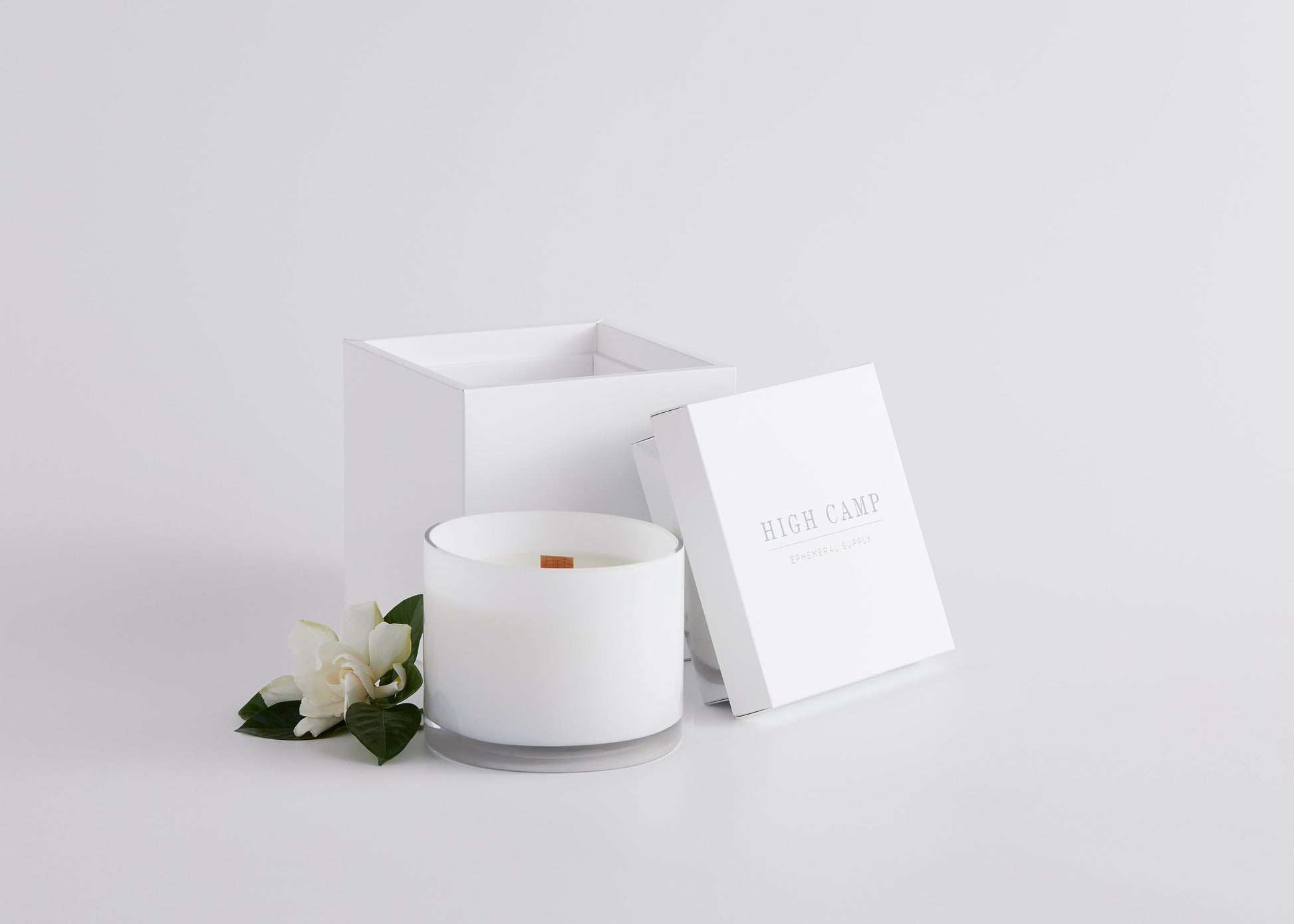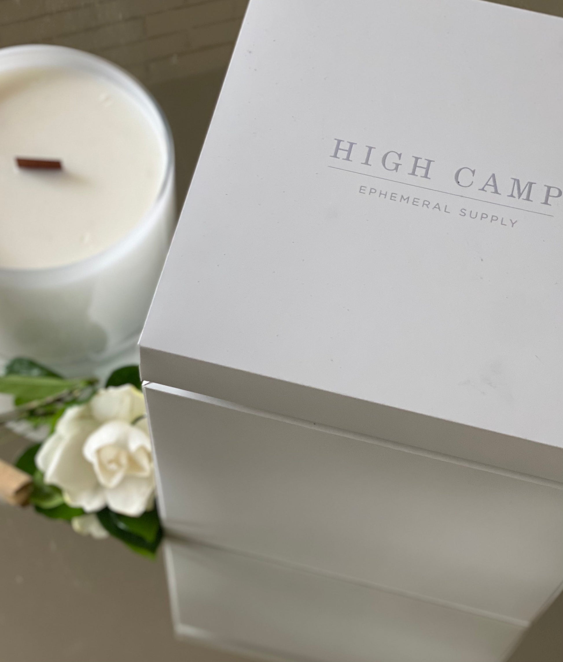 Nestled among twelve freshly cut vine & bloom High Camp Gardenias, the Siren Box features our large size Signature High Camp Gardenia & Palo Santo scented candle. Modernized with a crackling wide wood wick & hand poured in a gorgeous painted glass vessel that makes a charming vase for flowers once the candle is finished; this gift is sure to delight even the most discerning recipient. Shipped straight from the farm in our luxury candle gift box.